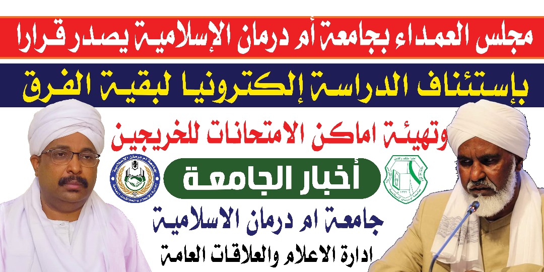 انعقد اليوم الثلاثاء ١٧محرم ١٤٤٧هجرية الموافق 2024/7/23م، في تمام الساعة الثامنة صباحاً الاجتماع الإسفيري الإستثنائي لمجلس عمداء جامعة أم درمان الإسلامية بحضور أعضاء الاجتماع لمناقشة الاستعداد لقيام امتحانات الفرق النهائية بالمراكز الداخلية والخارجية في موعدها المحدد ومعالجة بعض حالات الطلاب الاكاديمية.